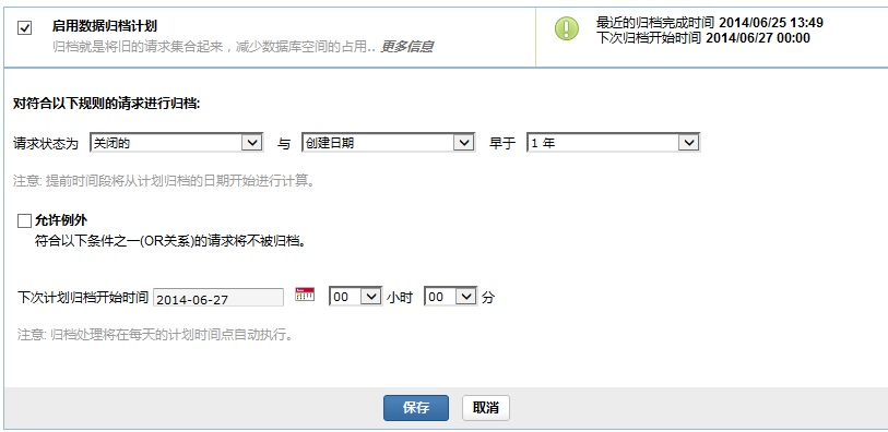 例如:执行归档的日期为2010-06-01,如果指定创建时间早于1年的任何状态的请求都归档,则所有2009-06-01之前创建的请求都被归档。