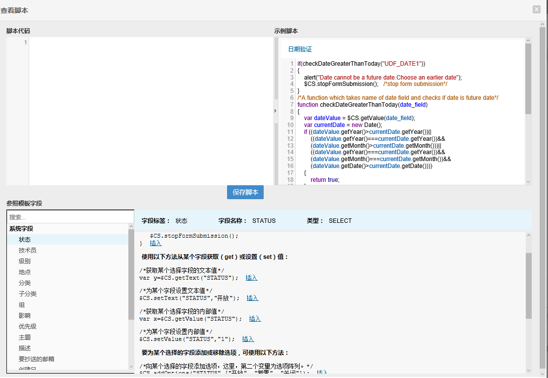 执行脚本(Execute Script) : 该动作将执行表单中的脚本,请确保脚本为有效的JavaScript代码,否则将不会执行。在执行脚本时,默认支持一些方法,如:要隐藏Category 和Level字段,可以调用以下方法: $CS.hideField(["CATEGORY","LEVEL"]);