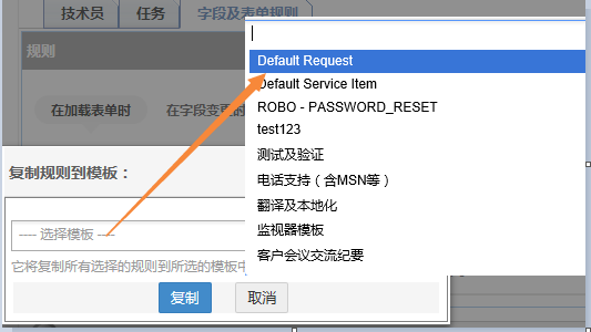 通过在动作菜单中的复制规则,可以将一个模板中一个或多个规则复制到其它模板中。复制规则时,如果其它模板中不存在规则中定义的字段,则该字段将不会被复制。同样地,如果在复制规则时,可以匹配条件/动作可以复制,则该规则也不会被复制。