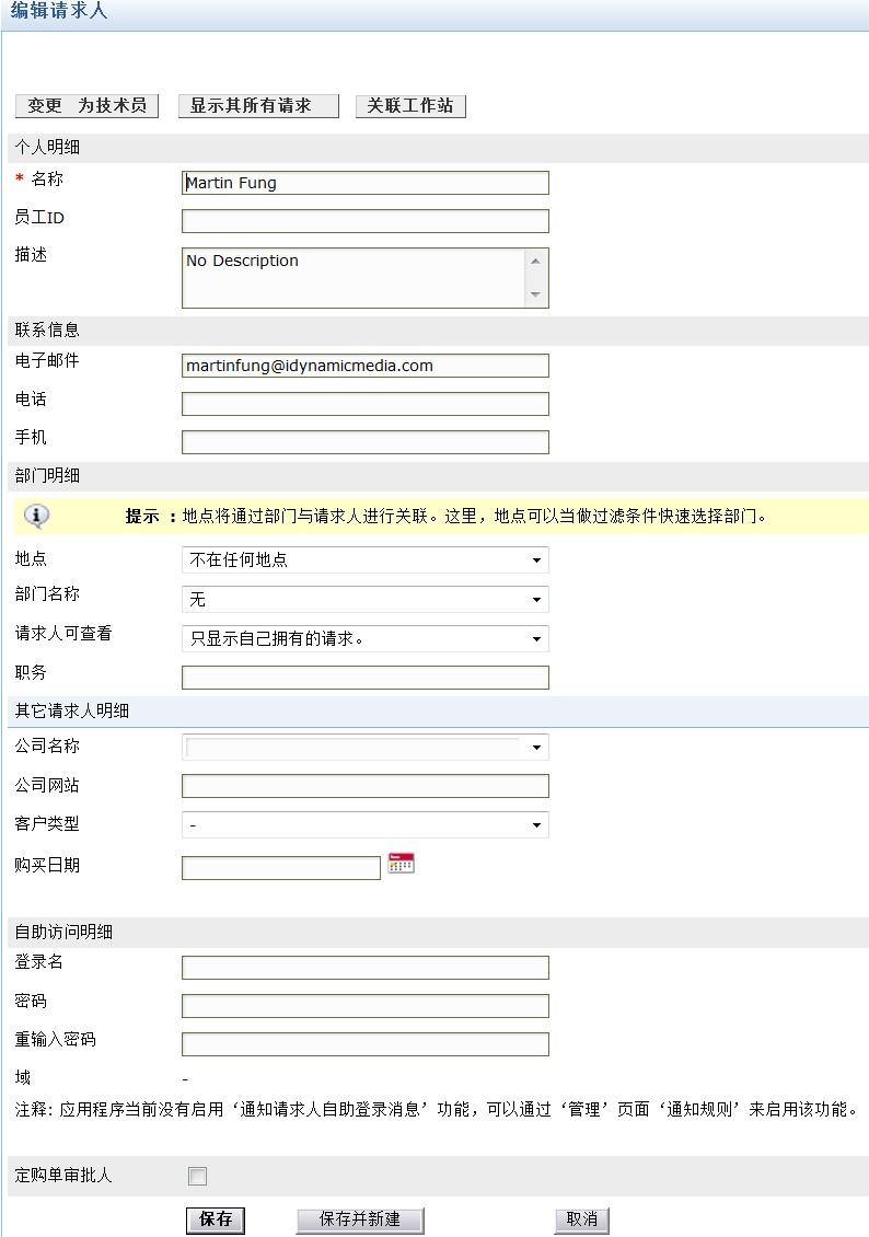 选择技术人员所属的部门,包括他所在的地点和相应的部门,并输入其职务。可以为请求人赋予一定的权限,允许他查看他自己的、他所在部门的、他所在地点的全部请求,可通过下拉框设定。