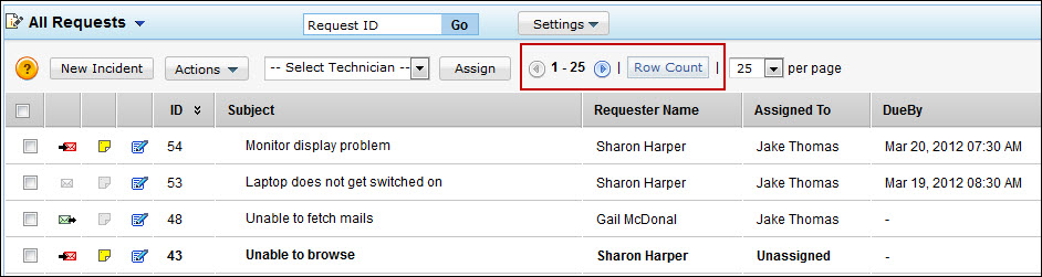 In the Request List View page, you would find a drop-down menu to select the number of requests to view per page. Limiting this number to 25 or 50 would eliminate loading of requests and improve the performance of ServiceDesk Plus.