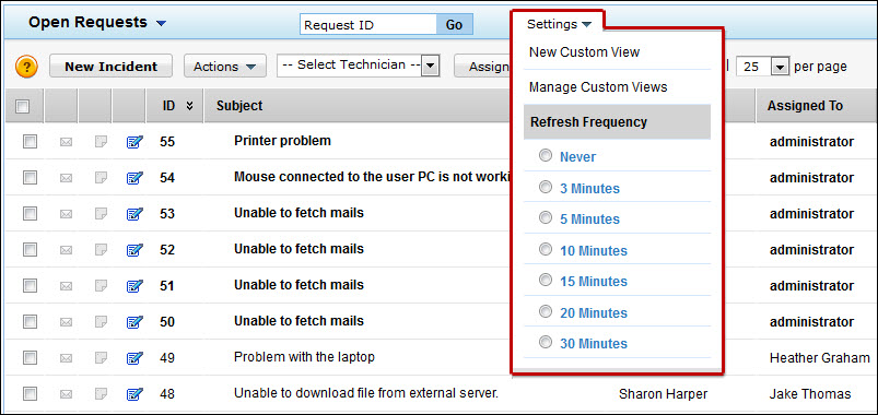 The Refresh Timer refreshes the request list view page at regular intervals. But this can slow down the performance of ServiceDesk Plus.