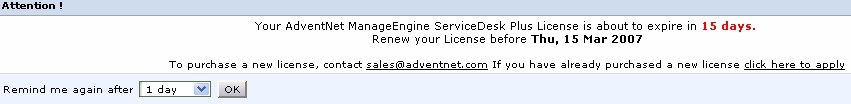 对于试用/年付费的ServiceDesk Plus,将会在主要页签的下面显示如下图的许可逾期警告。