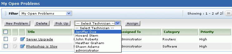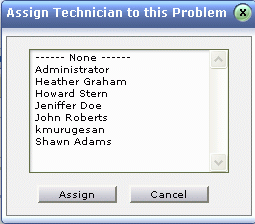 点击动作 -> 从列表选择指派技术员,弹出“为该问题指派技术员”页面,如下图所示。从列表中选择技术员,将问题指派给技术员。