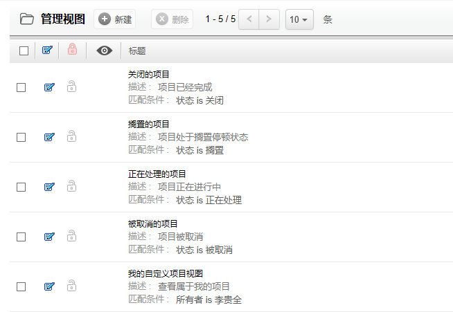 在项目自定义视图的管理页面,可以编辑、删除自定义视图。