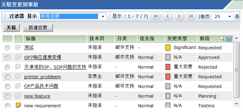 可从画面的过滤选项中选择需要显示的变更,如:所有变更、未处理的变更等等,得到需要的变更列表;