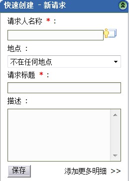 帮助台用户使用快速创建-新建请求表单,可以方便地新建请求,只需要输入请求人名、请求标题和描述。其它的明细可以由处理该请求的技 术者来填写。