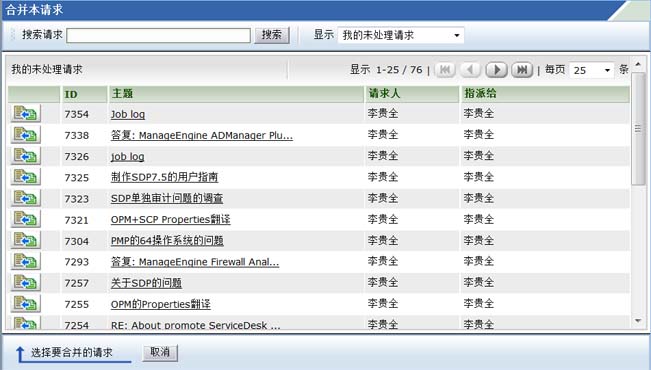 当两个或多个请求相关并且来自同一个请求人,而且可以由同一个技术员处理,则可以合并该请求,并指派该请求到一个技术员。