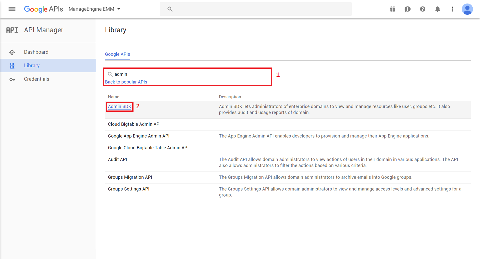 19. 同样的,在搜索框中输入'Admin',选择Admin SDK API。点击启用,启用Admin SDK API.