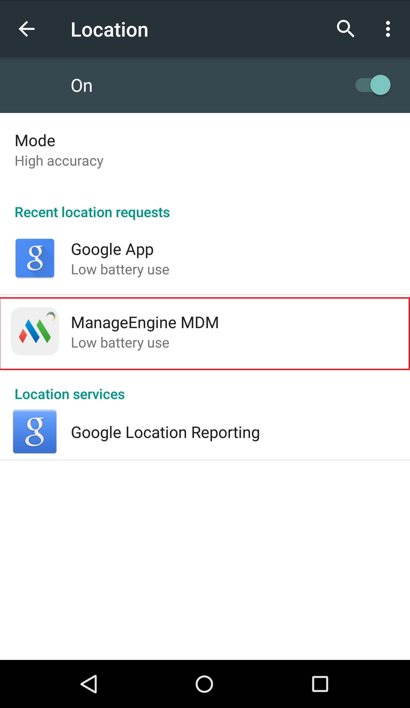 对于运行OS 6.0或以上版本的Android设备,用户必须在ME MDM app的运行权限中启用位置跟踪。为了确保位置跟踪总是在没有任何用户干预的情况下进行,请登记设备为设备所有者,并使用限制策略始终启用GPS。