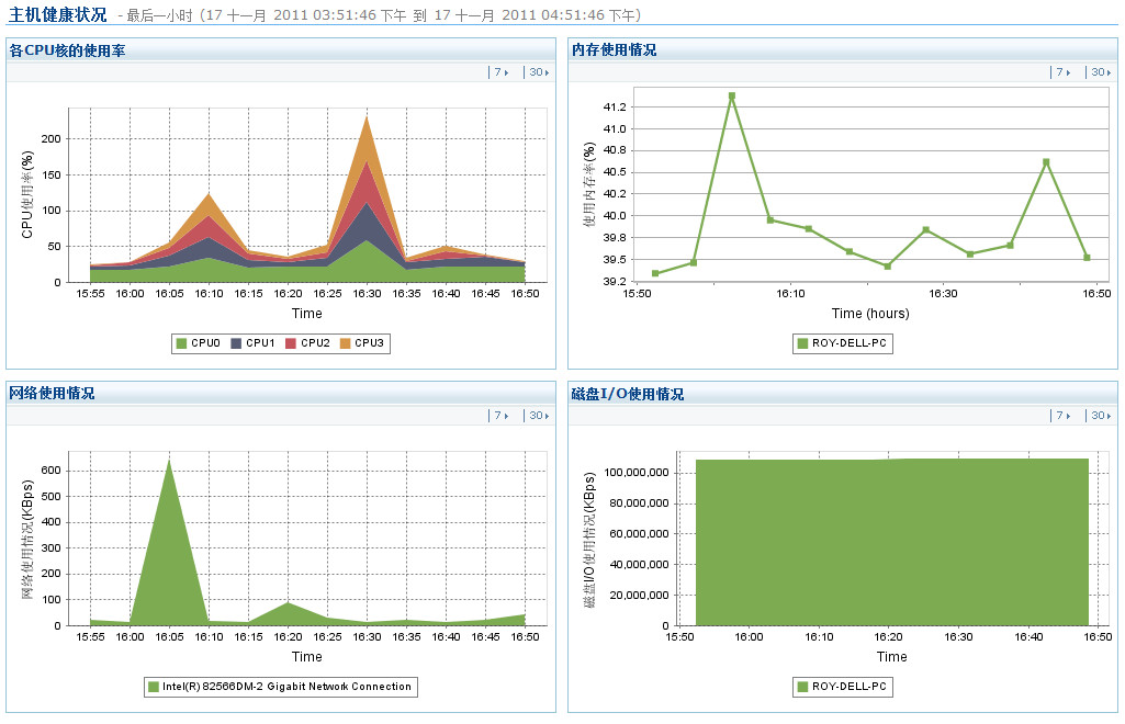 这个部分提供过去1小时主机的性能图表,你还可以查看过去7天和30天的报表。