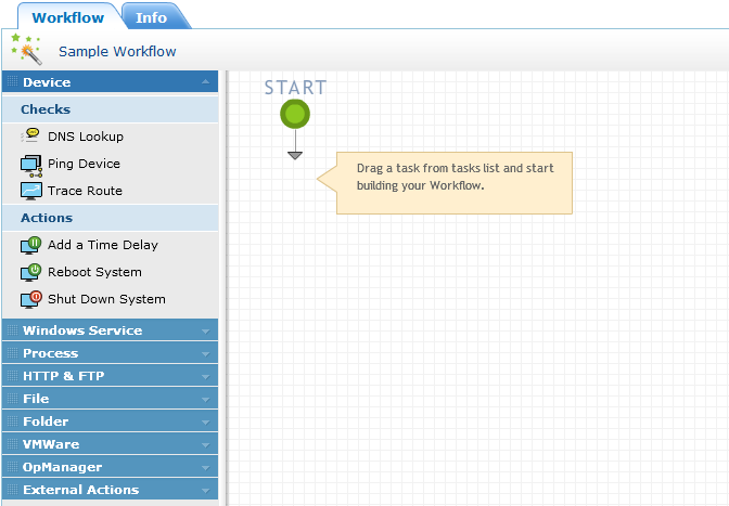 在IT工作流自动化模块,内建超过70个的工作流程检查和动作,分别归类在9个分类下,包括VMware ESX动作,帮助您构建一个强大的工作流规则,满足您的IT管理需求。您仅需要使用这些检查流和动作,就可以非常方便的在工作流构建器中创建您需要的流程。