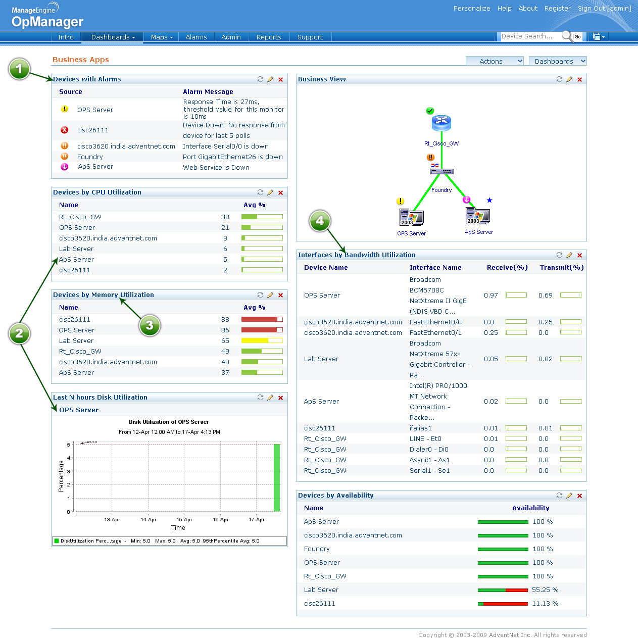 OpManager具备强大的可定制操控板,能够将监控的数据以直观易懂的方式呈现。OpManager包括90多个窗件,可根据管理员的要求定制操控板,以符合IT管理的需求。