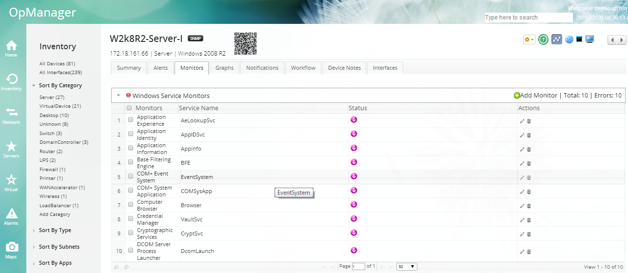 OpManager既允许用户在本地监控windows服务,也可以面向网络中的多个服务器远程监控windows服务。OpManager通过WMI来监控Windows服务,而且不需要在远程机器上安装代理。