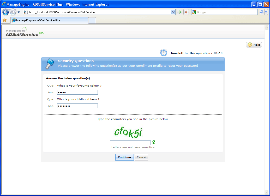 The power of self service to domain users in a Widows server environment ensures the administrator reduces the helpdesk workload and password /account-unlock tickets. Domain users have the option to password reset / unlock account self serve securely by accessing ADSelfService Plus web-based self-service portal that uses HTTPS web data transaction. Laid out for you below are the various screenshots of the simple and secure GUI's / functionalities a domain user will use for the self service options.