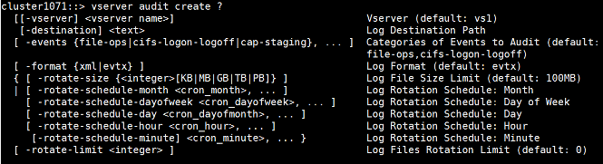 举例: vserver audit create -vserver vs1 -destination /cifs_audit_log -format evtx -rotate-size 200MB -rotate-limit 10
