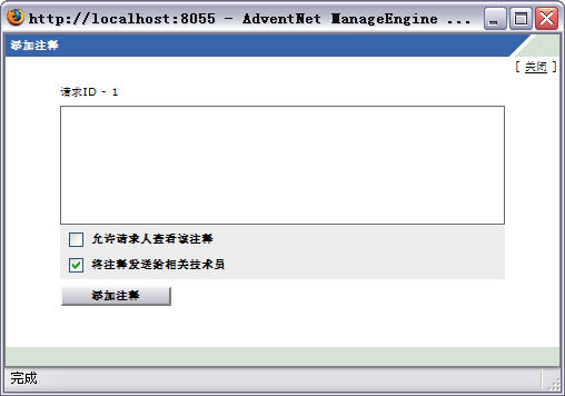 添加注释时,如果您想通知负责该请求的技术员,请选上将注释发送给相关技术员选项。如果允许请求人查看该注释,请选上允许请求人查看该注释选项。