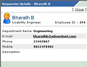 点击请求人明细中的请求人名称的链接,弹出显示请求人明细的对话框。那里将显示请求人的详细信息。包括:名称、Email,联系电话等。